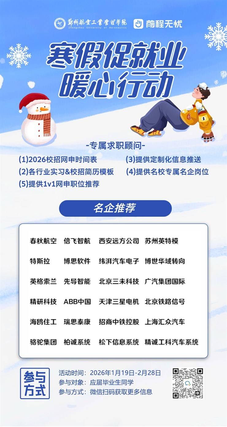 寒假如约而至,梦想步履不停。当冬日的暖阳洒满校园,我们也迎来了这场满载关怀与期许的“寒假促就业暖心活动”。毕业的钟声虽未敲响,但求职的征途已然开启 —— 我们深知,每一位怀揣理想的学子,都渴望在寒冬中握到一束照亮前路的光;每一份跃动的简历背后,都藏着对未来的无限憧憬。